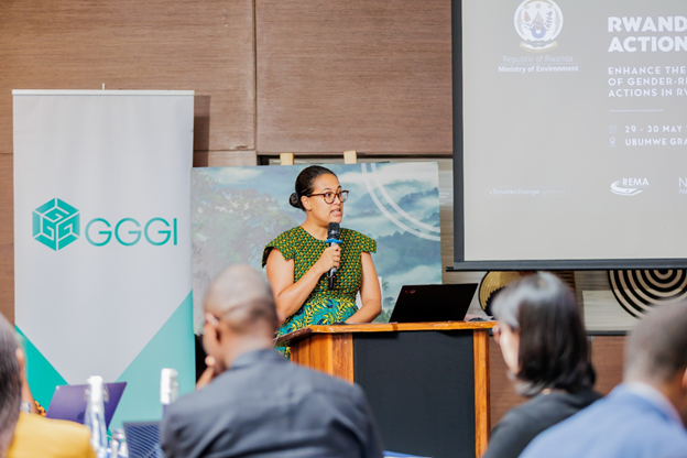 Caroline Raes, Country Representative of GGGI Rwanda, speaks during the consultative workshop to enhance Gender Equality and Social Inclusion in Rwanda’s NDC 3.0. ©GGGI Rwanda