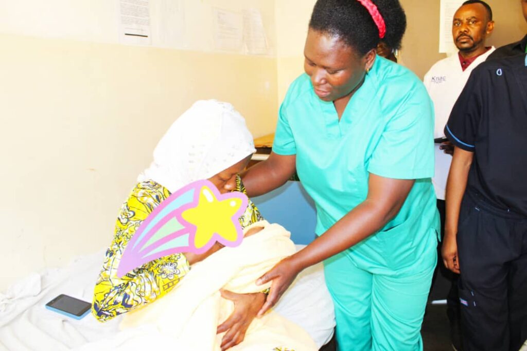 Fauste Uwingabire, a Neonatal Nurse by profession and a Maternal Newborn and Child Health Advisor at We for Health while helping a mother to breastfeed a newborn