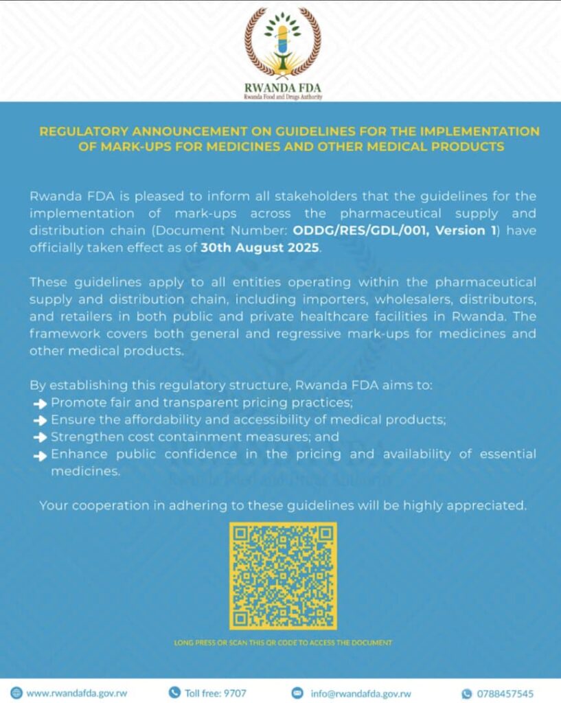 The Rwanda Food and Drugs Authority (Rwanda FDA) has announced the official implementation of new guidelines governing mark-ups for medicines and other medical products. The regulatory framework, outlined in Document Number ODDG/RES/GDL/001 (Version 1), took effect on 30th August 2025.